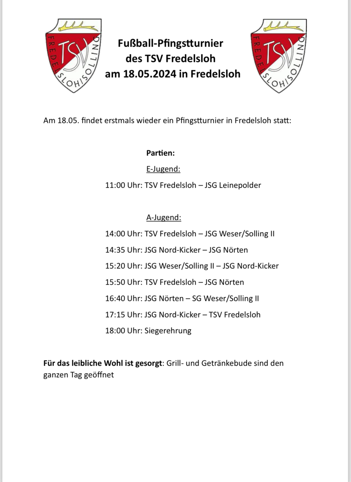 Am Pfingstsamstag, 18. Mai findet in Fredelsloh erstmals wieder ein Pfingstturnier statt. Es werden vier A-Jugend-Teams des Kreises teilnehmen und sich auf Kleinfeld im 6 vs. 6 + je einem Torwart gegeneinander messen. Natürlich wird auch der TSV mit einer eigene A-Jugend mit von der Partie sein. Außerdem sind die JSG Nörten, JSG Nord/Kicker und JSG Weser/Solling II mit am Start. Um 14 Uhr eröffnet der TSV und die JSG Weser/Solling II das Pfingstturnier. Gegen 18 Uhr ist die Siegerehrung geplant. Gespielt wird von 16er zu 16er. Für das leibliche Wohl wird gesorgt, die Grill- und Getränkebude wird den ganzen Tag geöffnet sein. Um 11 Uhr trifft bereits die E-Jugend des TSV Fredelsloh auf den JFV Leinepolder.